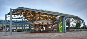 It states: "CDR Studio created a pavilion filled with sustainability features to house a carousel on New York’s Pier 62. A green roof planted with local grasses shades the carousel and includes solar panels, which can be used to power the attraction: Any excess energy goes back to the city’s grid. The firm used industrial materials—such as steel and concrete, as well as grille roll-down enclosures—as a nod to the warehouse that used to stand on the site."