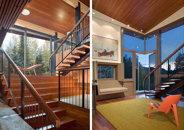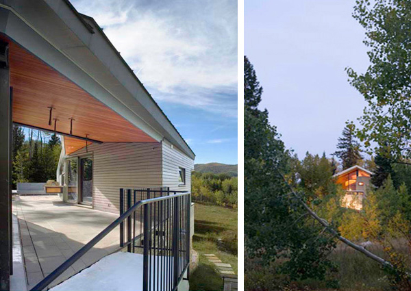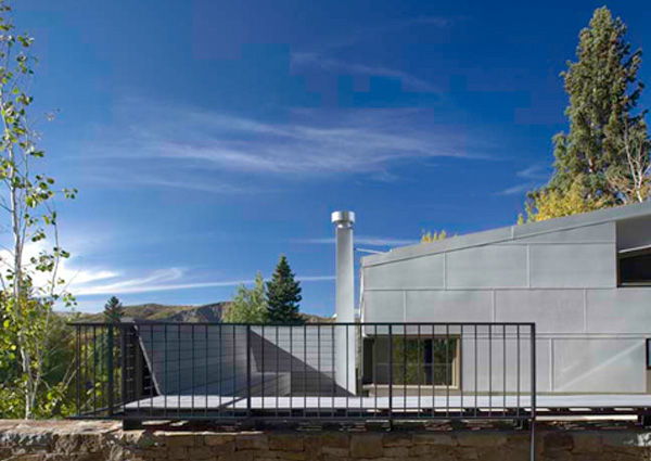 CDR Studio conceived of the roof as a tectonic plate, extruded and suspended above the earth's surface. Upper and lower segments of this plate have been sheared and staggered above and below the remnant roof. Upper and lower roofs are made of standing seam zinc-coated copper. They shed snow and, by virtue of their patina, blend with the coloration of the snow and aspen bark. The rebuilt cedar shingle roof exhibits tight overlap between courses of shakes, creating horizontality in counterpoint to the metal roof seams. The roofs are volumetrically intertwined: the zinc roof pulls over and above the existing wood roof and entry area. Cedar shingles hold snow while the metal roof sheds.